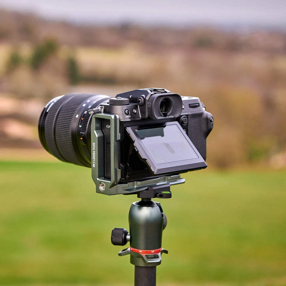 he convertible Gracy L-Bracket for FUJIFILM GFX 100S and 50S II from 3-Legged Thing is a dedicated L-bracket designed to perfectly fit the contours of both the FUJIFILM GFX 100S and 50S II medium format mirrorless cameras. Made of lightweight gray-tone aluminum alloy, it features Arca-type dovetails on each axis for mounting in both landscape and portrait orientation. The Gracy L-Bracket features a unique extendable base, enabling the use of tethering cables when used in portrait orientation. With two extendable positions, 5.11″ half extension and 5.55″ full extension, the upright component can be extended to the best-desired placement.