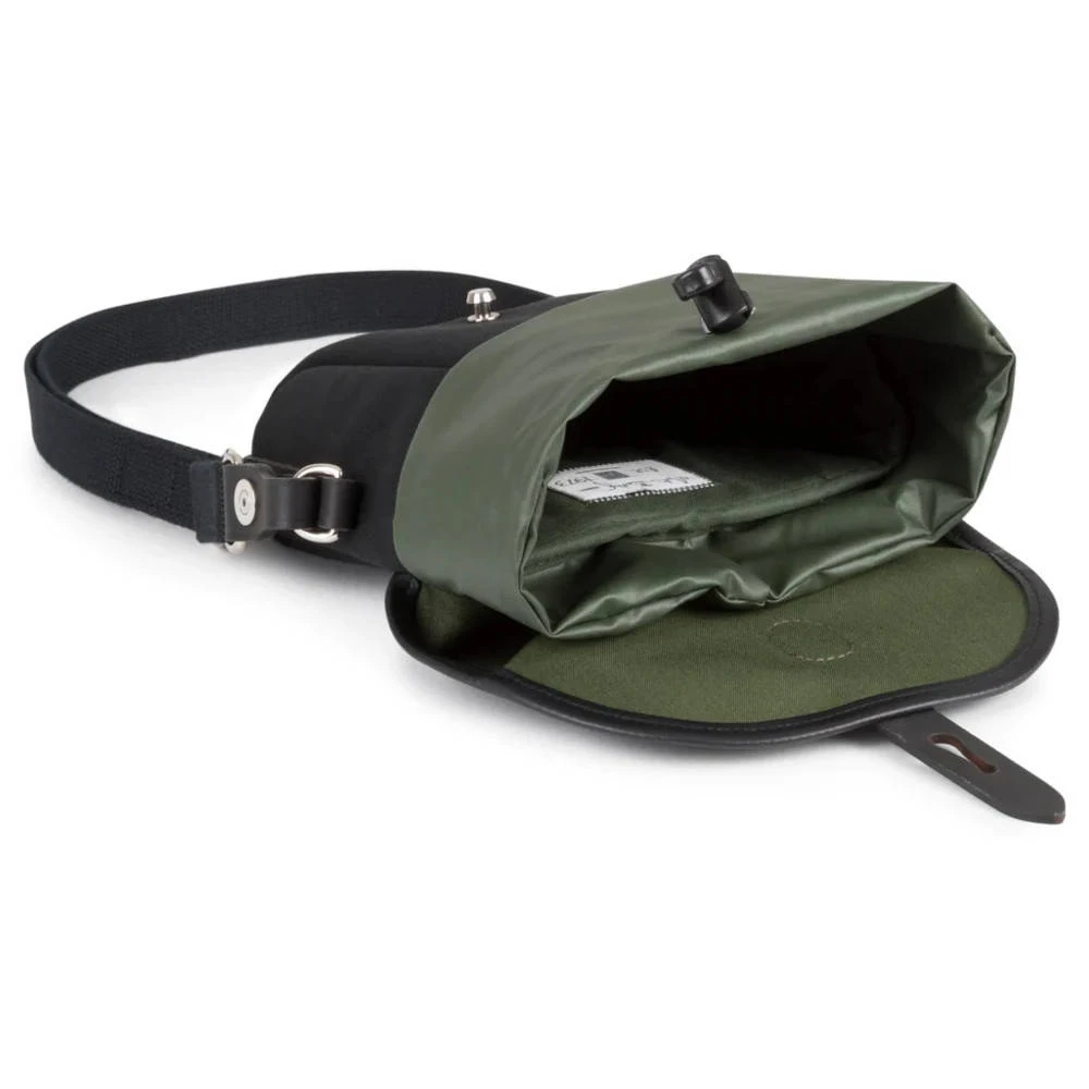 The Quick Release System leather front strap is stitched to the top flap for when you need quick and silent access during spotting sessions. Simply pull the leather strap down and off of the brass clogball to open.