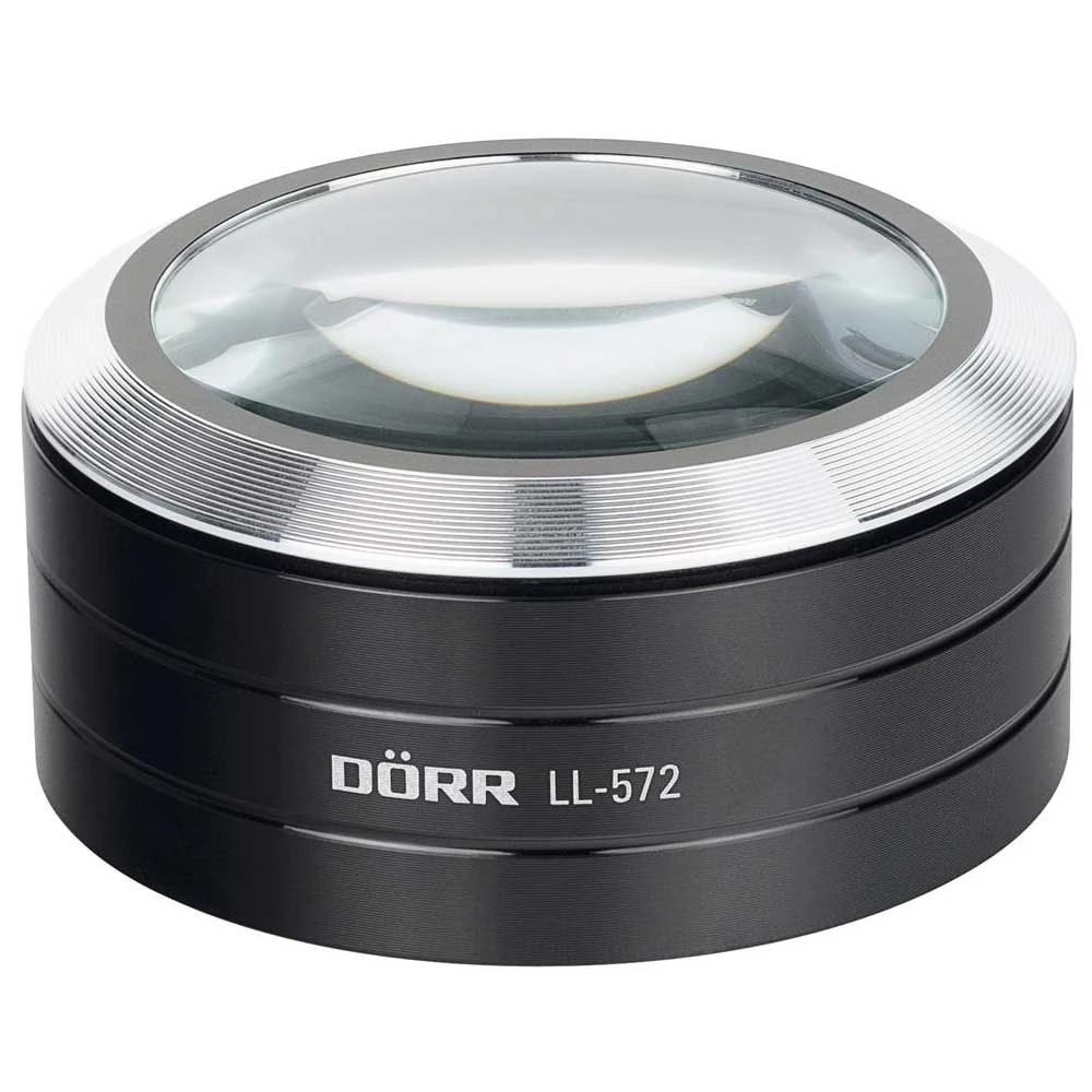 The Dorr LL-572 Professional LED Magnifier is a really great piece of equipment, for anyone wanting to magnify slides, text, or stamps for easy, detailed viewing. It has been manufactured using extremely high quality glass and the three LED lamps, illuminate the subject evenly. The lights are powered by two CR2016 button battery (supplied) and the aluminium housing makes it robust and comfortable to use. A short press on the top of the magnifier rim, turns on the bright LEDs and ensures an even and brilliant illumination and then another short press turns the lights off. It measures approximately 3.5 inches across at the base and 1.5 inches tall its ideal for hands free magnification.