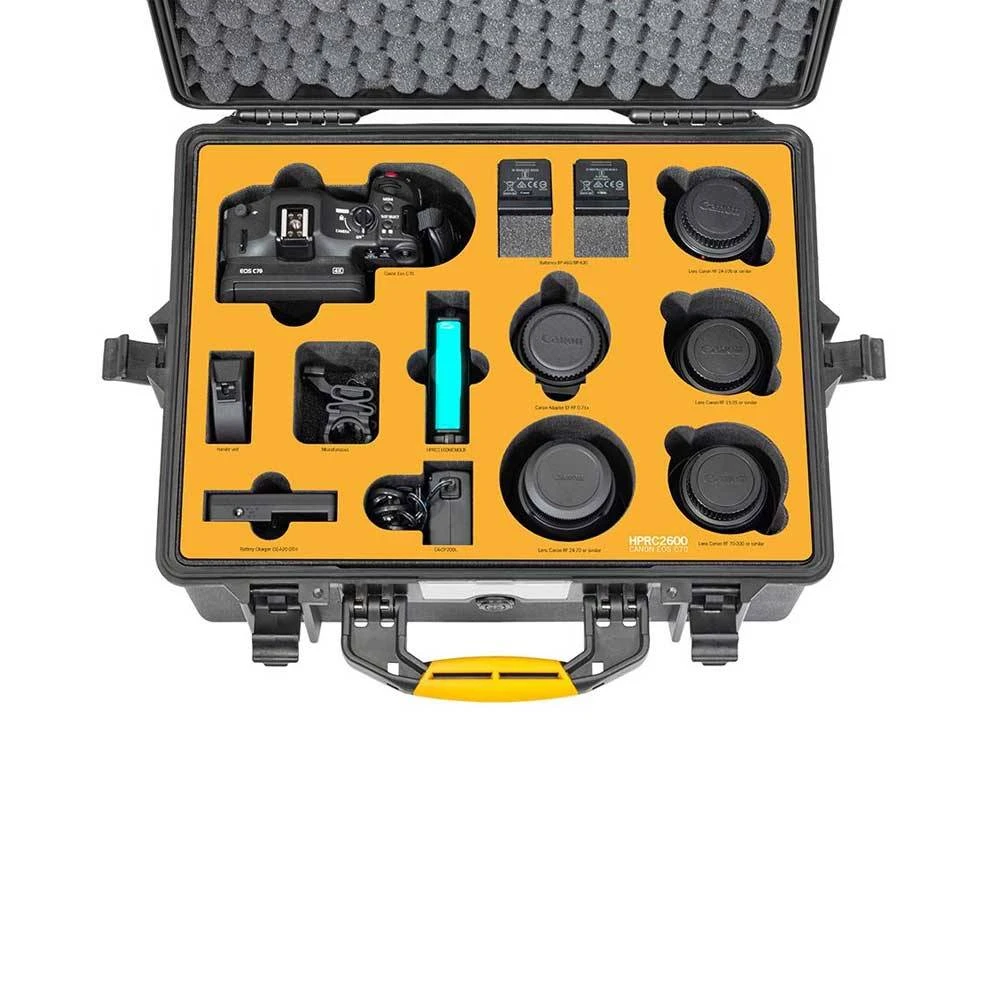 The pre-cut high density foam can fit: Canon Eos C70, Batteries BP-A60/BP-A30 3, Lens Canon RF 24-105 or similar, Lens Canon RF 15-35 or similar, Lens Canon RF 70-200 or similar, Lens Canon RF 24-70 or similar, Canon Adapter EF-RF 0.71x, HPRC1300MEMBLB, CA-CP200L, Miscellaneous, Battery Charger CG-A20 OTH, Handle unit.