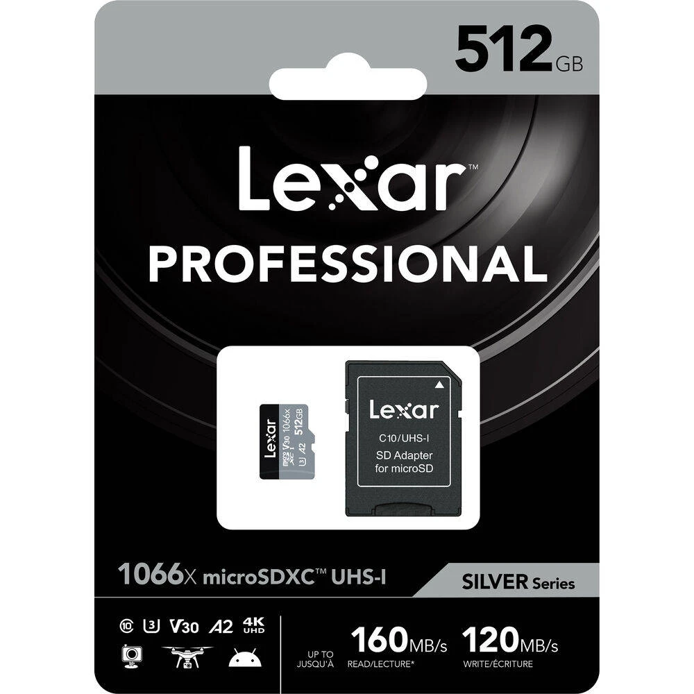 Designed for your action cameras, drones, or Android smartphone, the Lexar Professional 1066x microSD UHS-I Card SILVER Series lets you quickly capture and transfer high-quality photos, including Full-HD and 4K UHD video with speeds up to 160MB/s read, and up to 120MB/s write. The card is U3, V30 and A23,4 rated for high-speed performance. This card gives you the speed and storage you need to capture more adventures on the go.