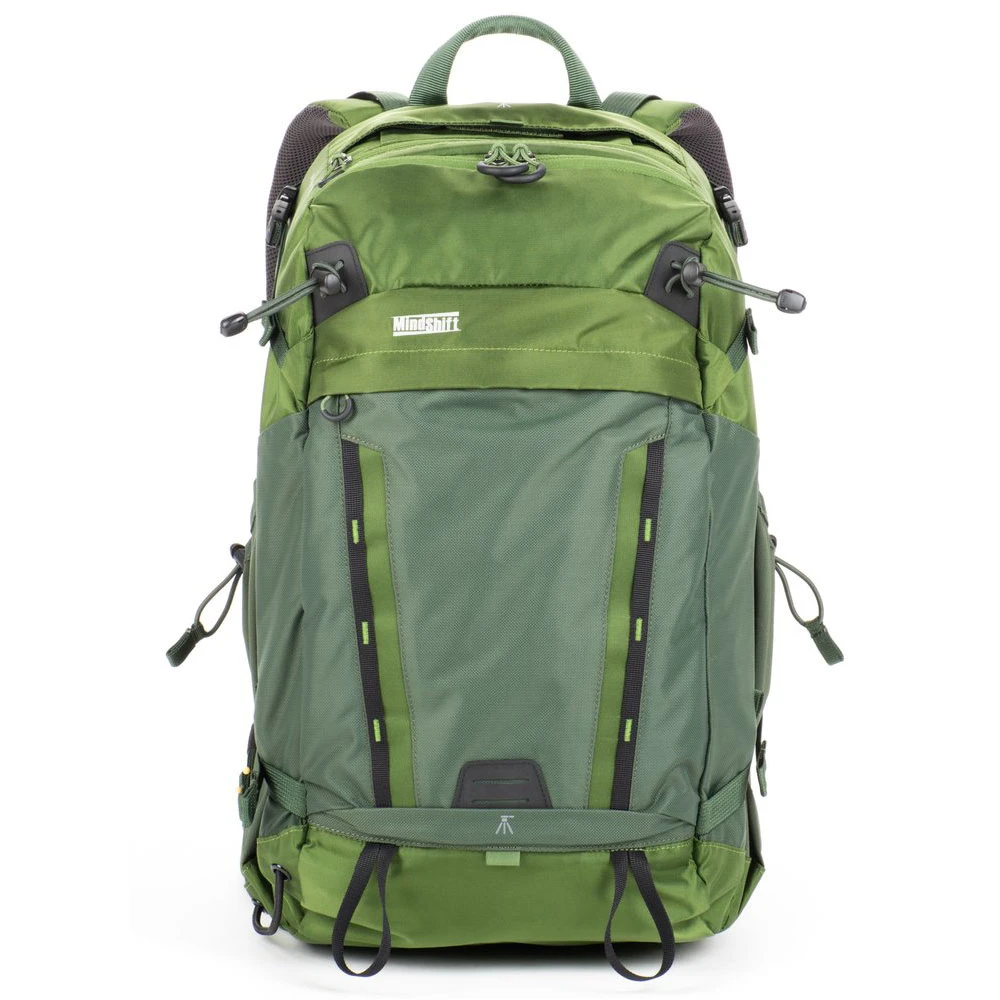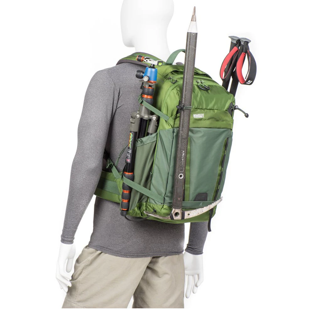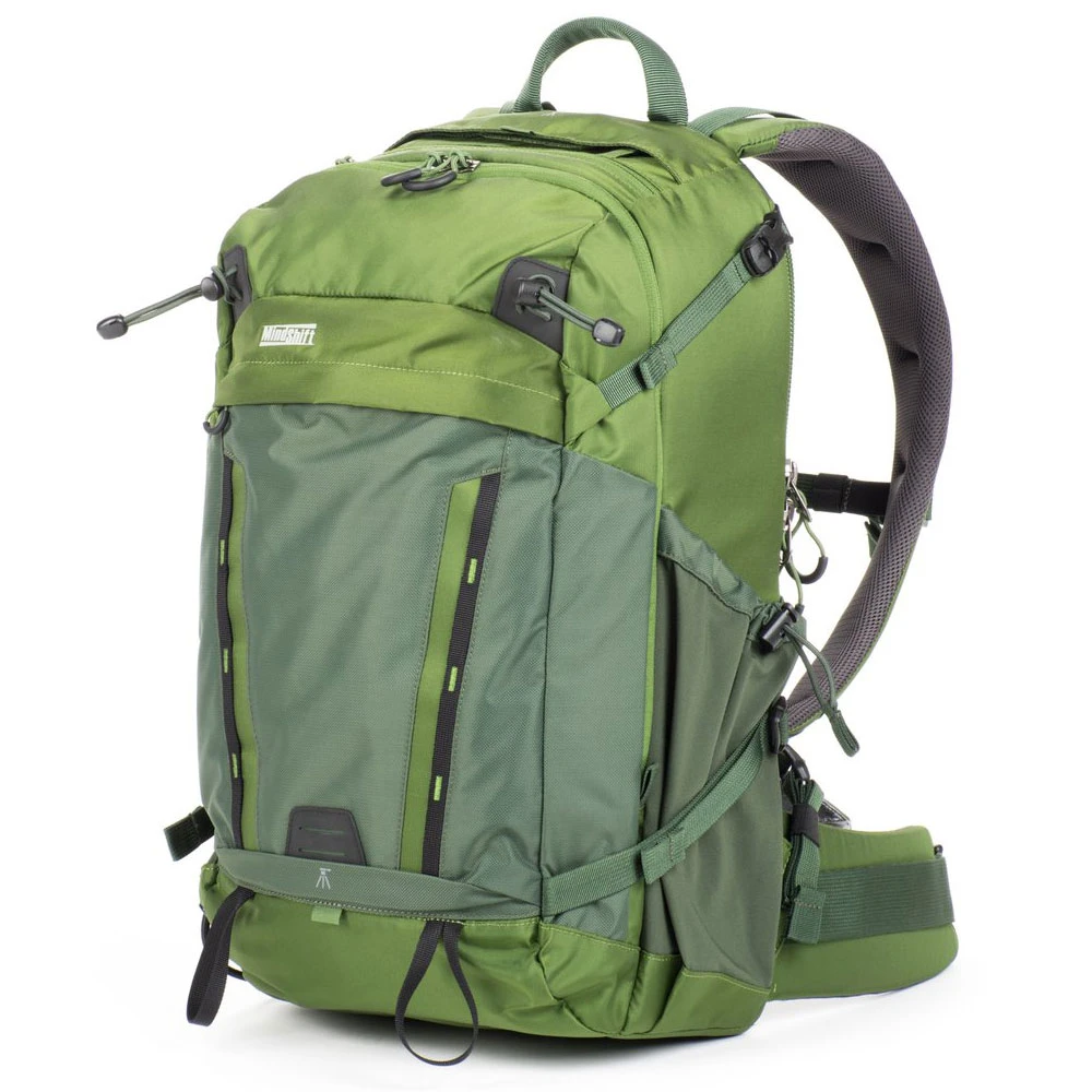 A comfortable padded waist belt provides all-day comfort on the trail with webbing rail for additional MindShift accessories and side compression straps with locking SR buckles for additional lash points. Seam-sealed rain cover included