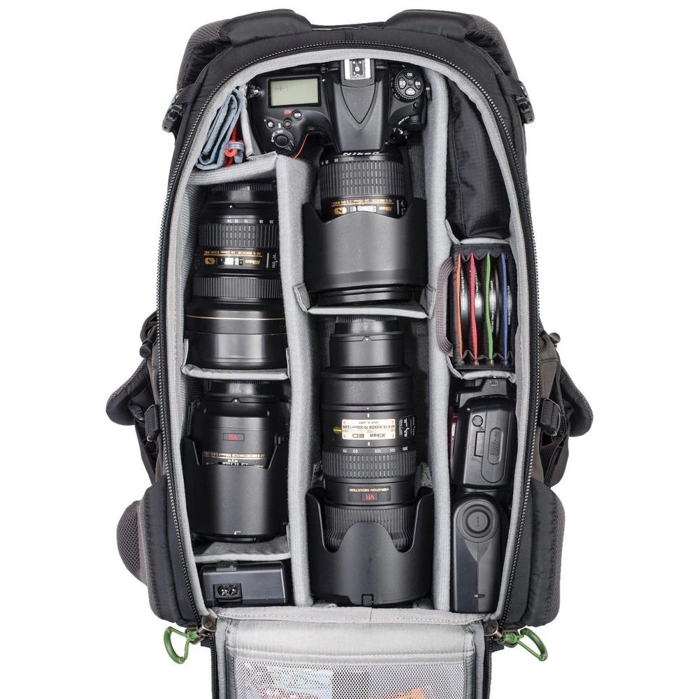 The Mindshift Gear BackLight 26L will hold a standard-size DSLR and 4-6 standard zoom lenses plus a flash OR 2 large mirrorless cameras and 5-7 lenses plus a flash. A dedicated compartment will fit up to a 15″ laptop and a full-size tablet. The front pockets of the BackLight 26L will carry a total of 9L personal gear such as extra layers, light jacket, food etc.