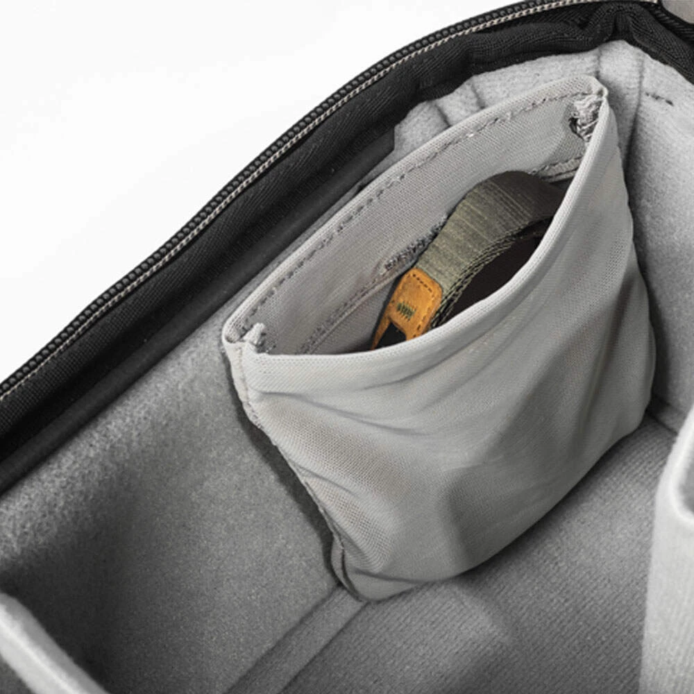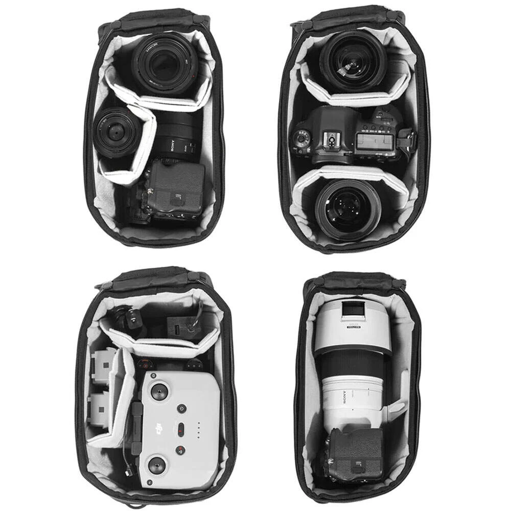 FlexFold dividers enable customizable organization and protection. Vertically stack items for maximal capacity. Floating pocket stores lens caps, filters, and other small items.