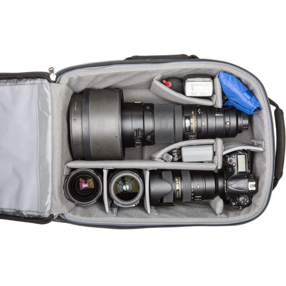 The Think Tank Airport Security V3.0 Rolling Case features a specially designed interior to maximize gear for carry on – meets most International (and U.S) airline carry on requirements*. The Airport Security V3.0 will hold 2 gripped DSLRs with lenses attached plus 4-6 additional lenses, as well as a 17″ laptop and a 10″ tablet (max lens 600mm f4 detached or 500mm f4 attached). Features TSA-approved zipper locks for the main compartment and a high-strength coated cable and combination lock for the laptop compartment and to secure your bag to an immovable object. A tripod mount pocket on the side of the case allows attachment of a tripod – for larger tripods there are additional straps included. Internal zippered pockets for small accessories such as batteries, memory cards filters and more.