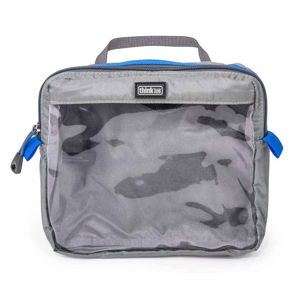 The T244 Think Tank Cable Management™ 20 V2.0 Organiser case is a small sized organizer pouch. It has internal dividers to keep your gear organized and tangle free. It can accommodate various photo accessories in the main compartment. It has a dedicated clear slot located on the front of the bag for business cards or other identification, a zippered front pocket, and a built-in carrying handle.