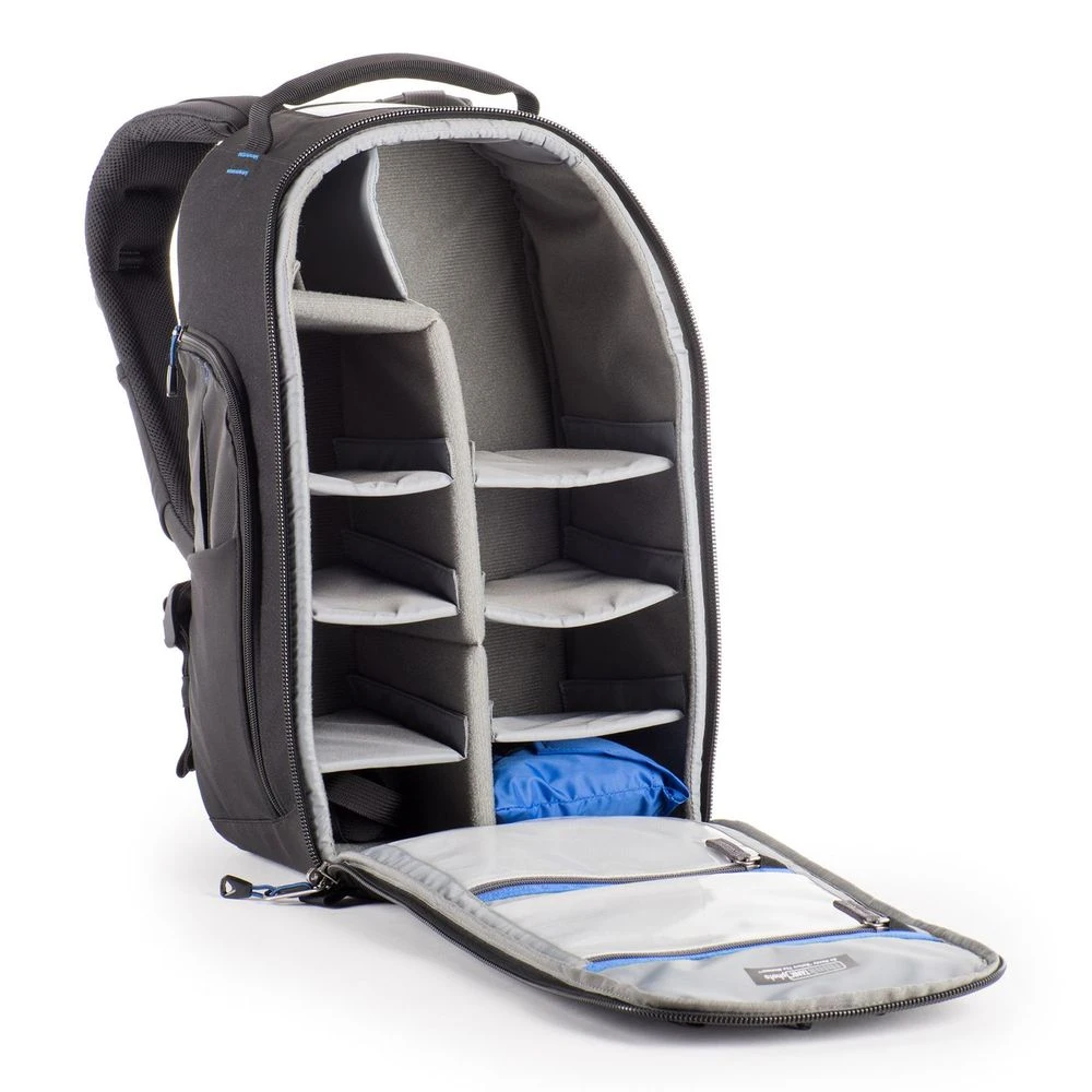 This Think Tank Streetwalker Pro Backpack V2.0 features a slim, contoured, body-conforming design with a wide shoulder strap which provides a very comfortable fit. Made with lightweight materials, the Streetwalker V2.0 also features a breathable 320G air-mesh back panel which keeps your back cool during long days. The main compartment features fully customisable interior dividers which house 2 gripped DSLRs, 4-6 standard zoom lenses (max lens size 400mm f2.8). A dedicated compartment will hold a 10″ tablet or small laptop. An easily accessible front organizer pocket will hold extra batteries, memory cards and other small accessories you may need. A rear internal pocket will hold documents.