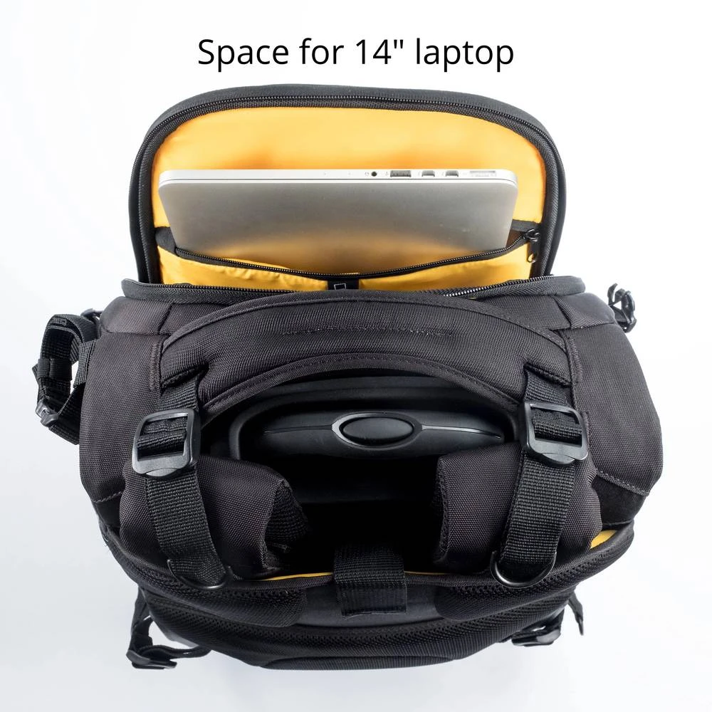 The organized storage system will facilitate all your travel needs while on-the-go as well as an efficient workflow while on location: separately padded compartments will fit a tablet and up to a 14” laptop, (compartment is 290x25x410mm). Large external front pockets with organizer inside will store all you need close at hand when traveling, like a tablet, chargers, smartphone, travel documents, wallet, sunglasses, etc.