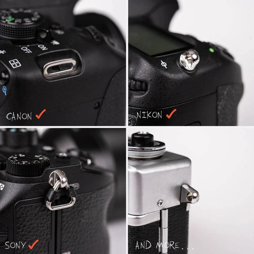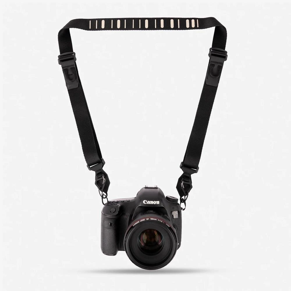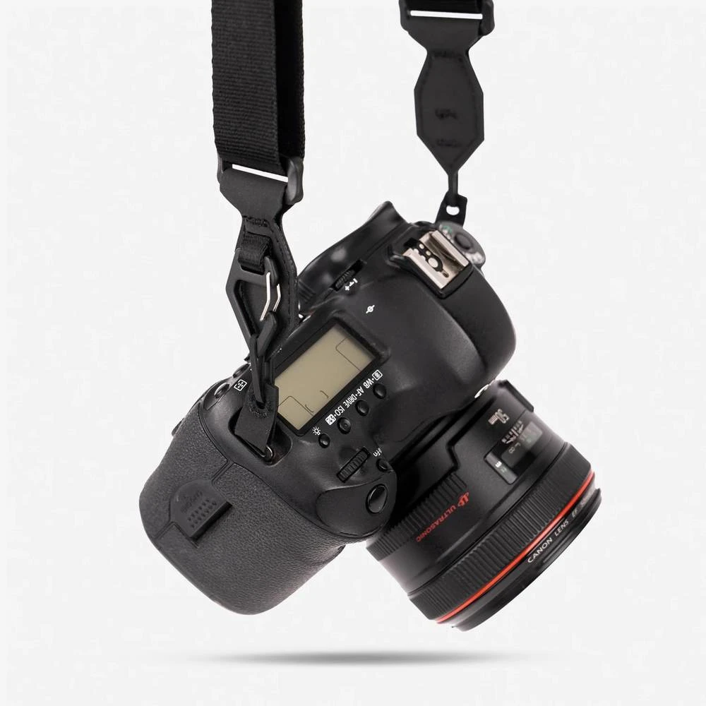 A quick and easy-to-use system designed to work with any camera. The anchor-less system means you won’t have to leave any hardware dangling on your camera.